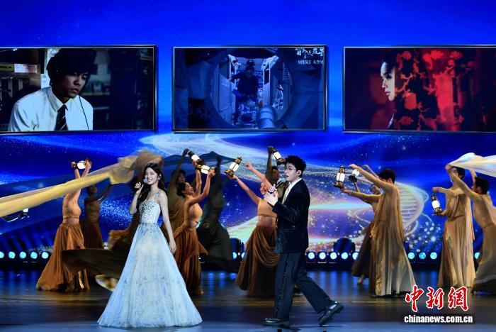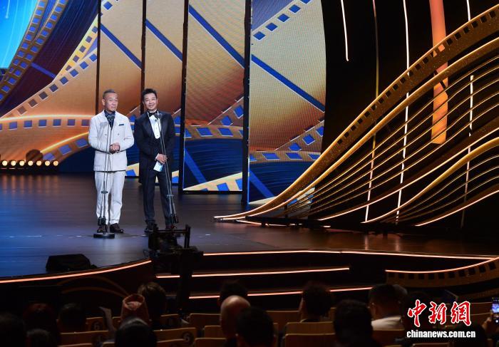图为上演贵宾缓若晗(左)战焦迈偶正在开动典礼演出唱二岸同创的典范影戏歌直。中新社记者 弛斌 摄